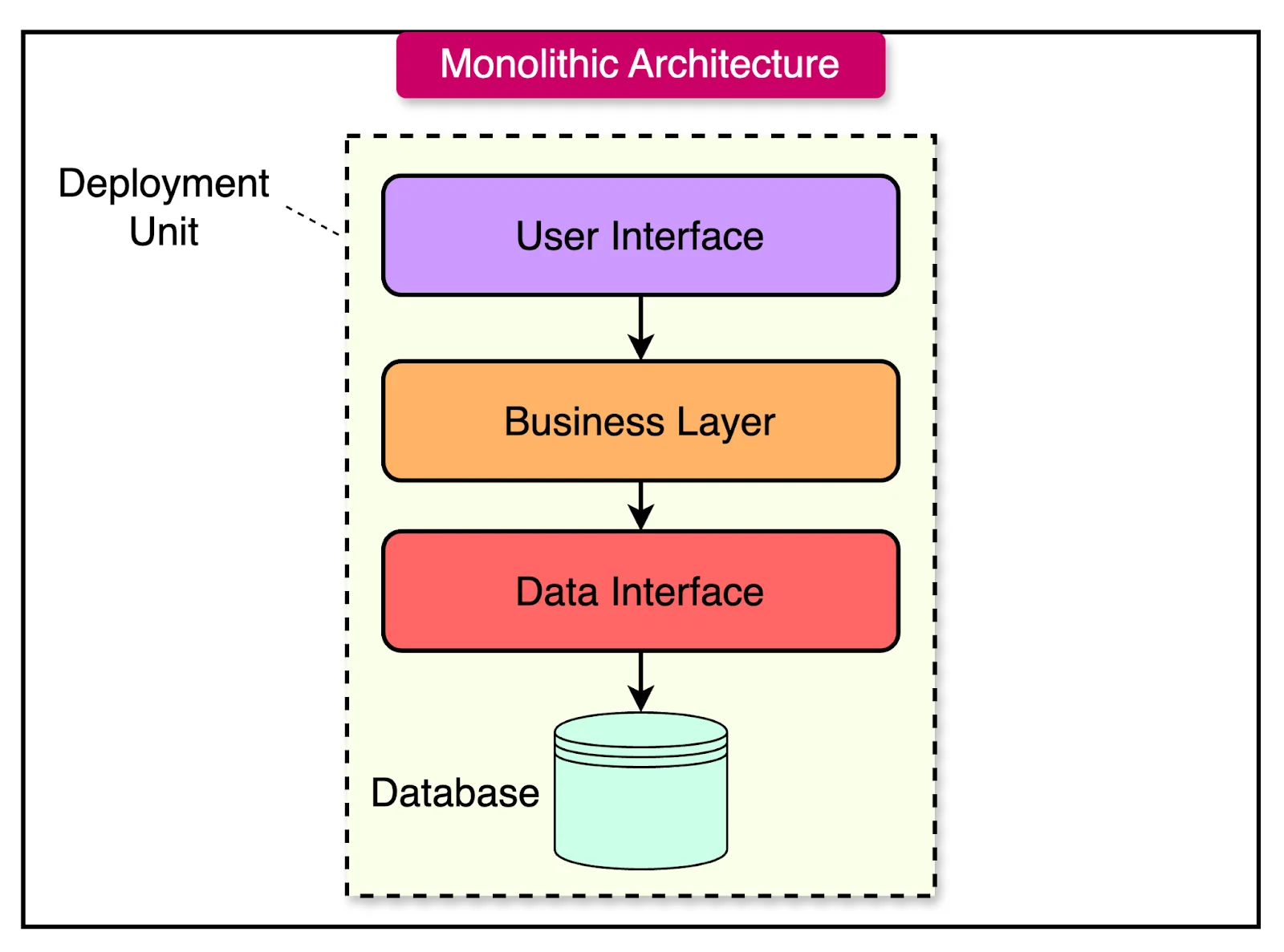 Monolithic Architecture adalah arsitektur paling klasik dan sederhana dalam dunia software development. Pada pendekatan ini, seluruh bagian aplikasi — mulai dari UI, API, business logic, hingga akses database — digabungkan dalam satu codebase besar dan biasanya dideploy sebagai satu aplikasi tunggal.